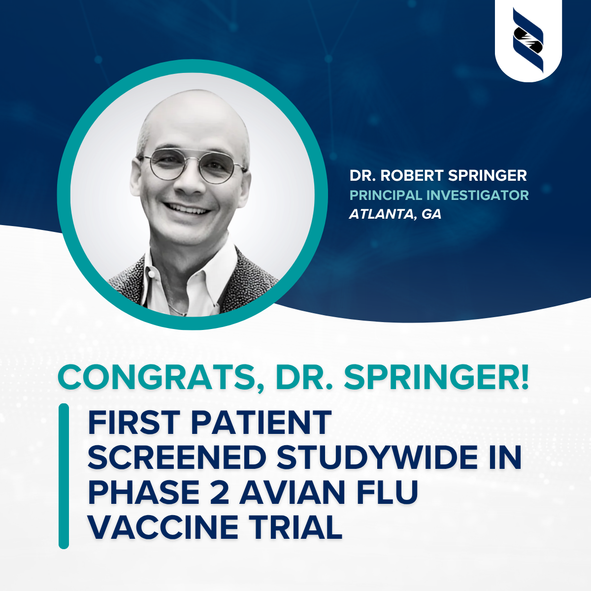Congratulations to Dr. Robert Springer and the entire team at DelRicht Research at Springer Wellness and Restorative Health in Atlanta, GA, for screening the first patient study-wide in an ongoing Phase 2 Avian Flu Vaccine Trial.